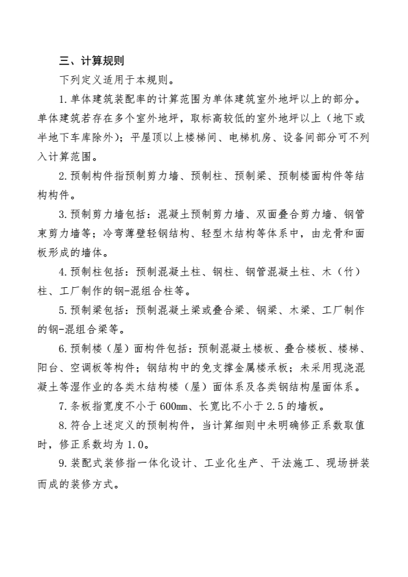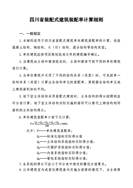 《四川省裝配式建筑裝配率計算細(xì)則(試行)》實施以來,對全省裝配式建筑裝配率計算起到了積極的指導(dǎo)和規(guī)范作用。為進一步推動我省裝配式建筑的發(fā)展,規(guī)范裝配率計算,提升標(biāo)準(zhǔn)化建設(shè)水平,推進系統(tǒng)集成技術(shù)發(fā)展應(yīng)用,我廳組織相關(guān)單位進行了修訂,并經(jīng)專家審查通過,形成了《四川省裝配式建筑裝配率計算細(xì)則》,現(xiàn)予印發(fā),自 2020 年 10 月 1 日起實施。